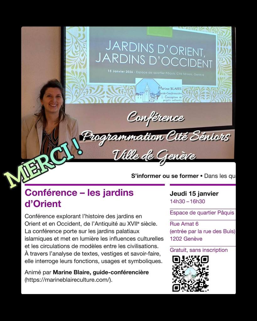 Vous étiez plus de 30 personnes présentes ce jeudi 15 Janvier 2026 à ma conférence « jardins d’Orient, jardins d’Occident », que j’ai eu le plaisir de présenter à l’espace de quartier Pâquis à Genève !